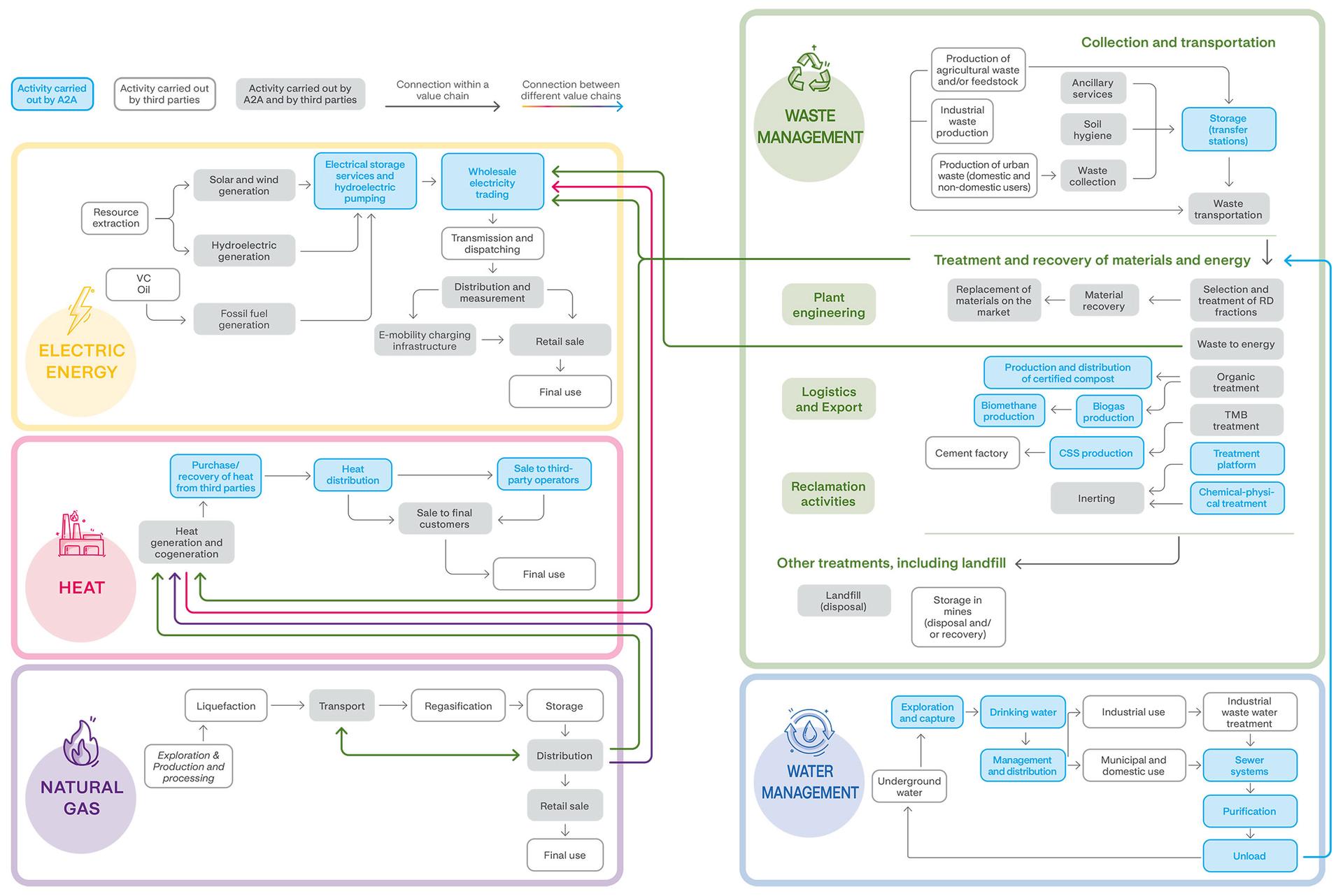 Our circular economy model enables us to transform waste, water and heat into new resources: a virtuous system where everything can have a new life. We collect all recyclable waste thanks to a sorted collection service and we turn it into new material. Anything that cannot be recuperated is recovered in the form of energy. We purify water, previously treated and distributed to homes, and return it to the areas we serve. We generate heat and we recover it from industrial activities, from WtE plants and from renewable sources to provide district heating for buildings.