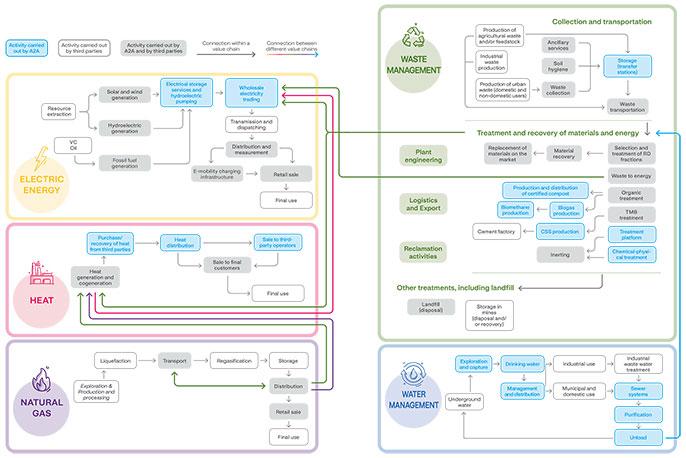 Our commitment for more sky-blue life is reflected in all the fields in which we are active. We have always dealt with energy, water and the environment with a circular use of natural resources and, thanks to our concrete action and to cooperation with communities and with the areas where we operate, we have so far achieved a lot, looking to the future. In the services we provide, our thoughts are on the future of the Planet: we have put ESG (environmental, social, governance) objectives at the heart of our strategic plan to 2030 and, thanks to these, we are increasing even more the pace at which we are moving to fulfil the ecological transition.
