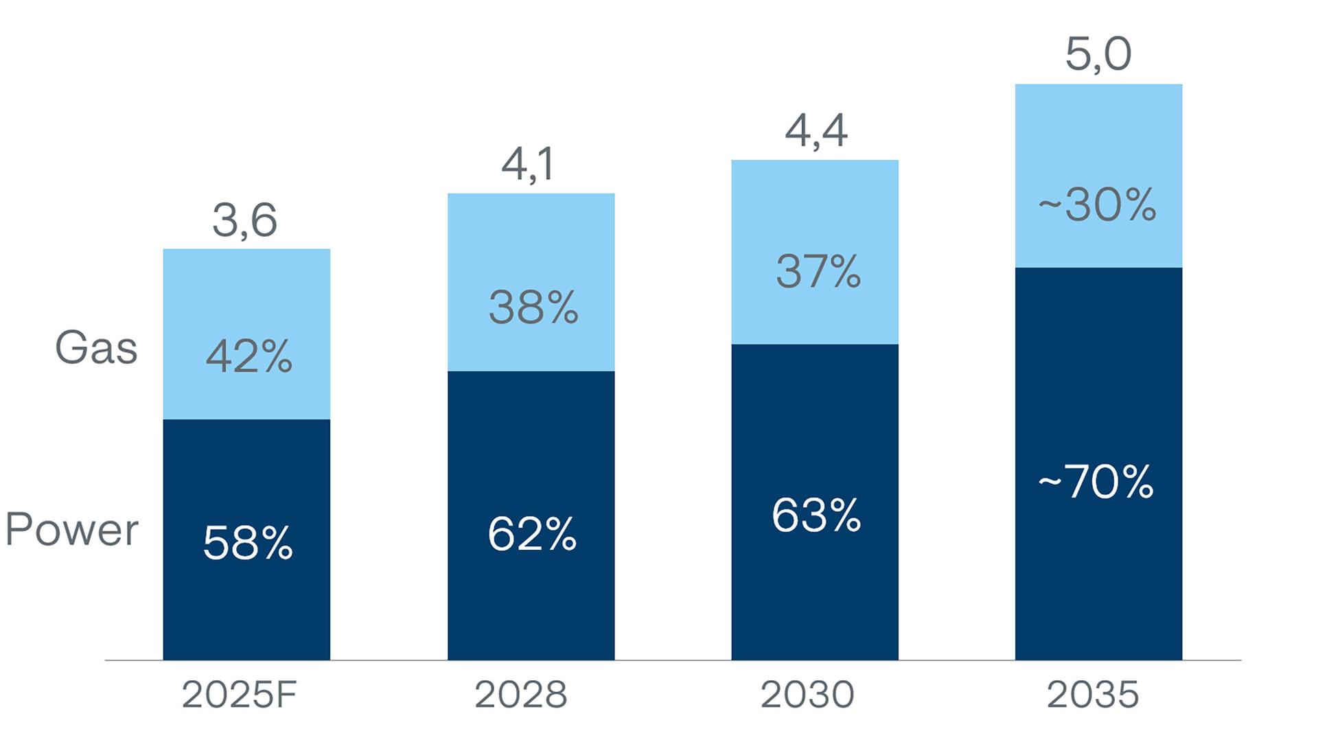 Nell’ambito della transizione energetica prevediamo di raggiungere 4 miliardi di euro di RAB nelle reti elettriche, 3,7 GW di capacità eolica e fotovoltaica e 5 milioni di clienti al 2035.